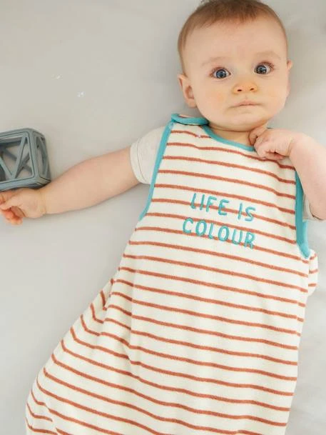 Les beaux jours sont là, on ose la couleur ! Matière éponge et rayure esprit marin, voici tout ce dont on rêve pour les nuits d’été de bébé ! Une gigoteuse légère et tendance avec ses larges bords-côtes contrastés et un petit message brodé pour encore plus de personnalité ! Confectionnée sans ouatinage, elle couvre bébé tout en douceur lorsque les nuits sont chaudes.