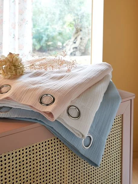Coloris tendre et légèreté s’associent à la douceur du lange pour parer la fenêtre de la chambre de ce charmant rideau tamisant.